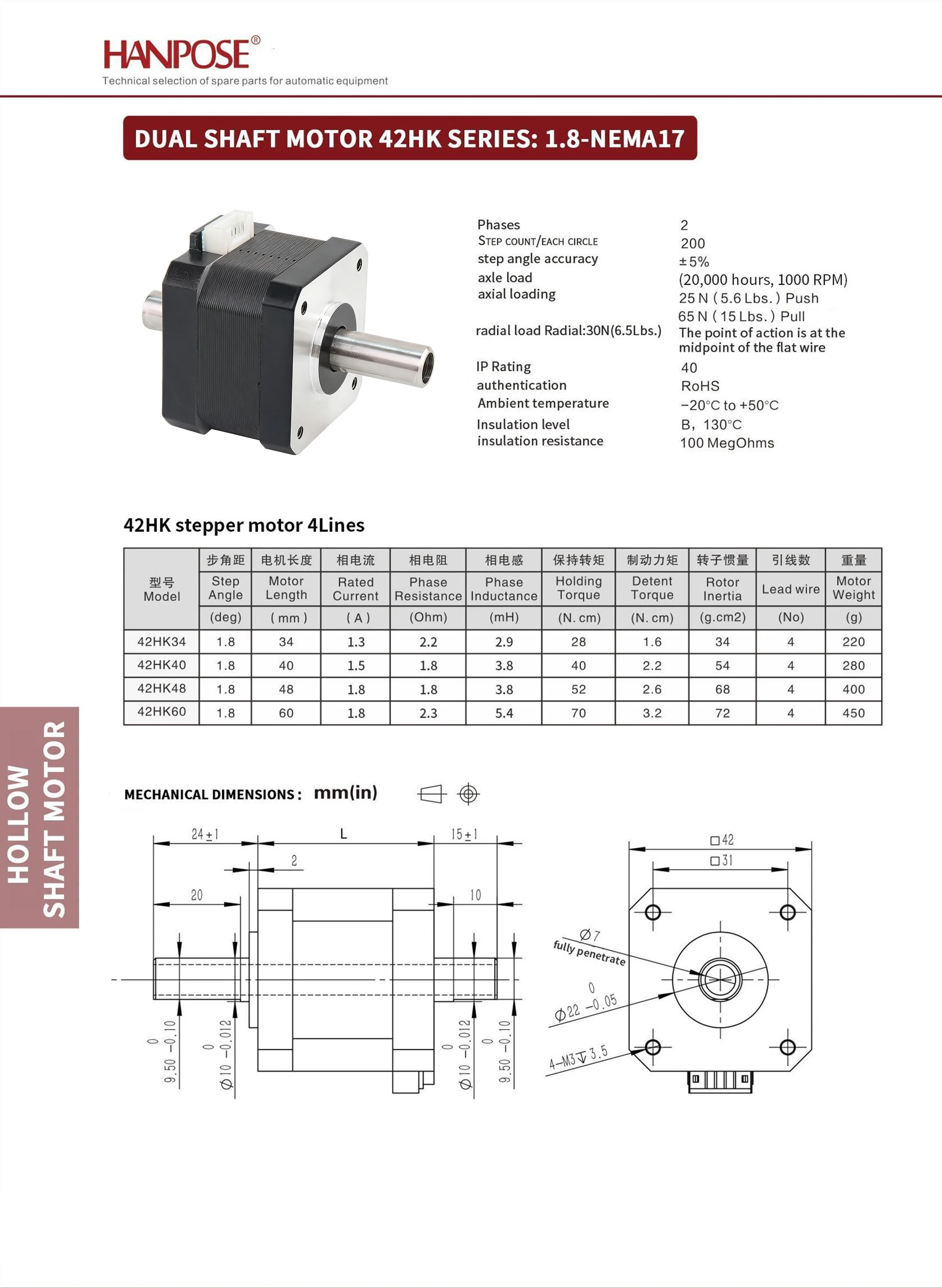 HANPOSE gratis fragt: 1,5 A, 40 N·cm, 42HK40/34/40/48/60 CNC-fræsemaskine hul biaxial motor med gevindhul, Nema17 to-akset motor