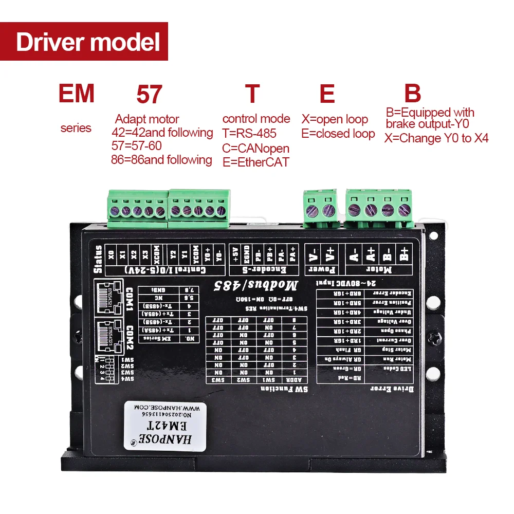 HANPOSE EM42T sammumootorite juhtimisseade on kvaliteetne, paindlik ja vastupidav lahendus NEMA17 ja NEMA23 sammumootorite juhtimiseks. Toetatud suhtluse protokollid Modbus RTU, CANopen ja EtherCAT, täpne voolu reguleerimine ning kaitsefunktsioonid teevad selle sobivaks laia valiku rakenduste jaoks. Kas ehitate automatiseerimissüsteeme, robotite või CNC-masinaid, HANPOSE EM42T pakkub vajalikku jõudlust ja usaldusväärsust